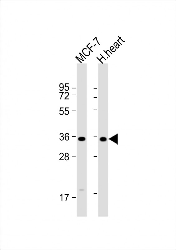 All lanes : Anti-GPD1L Antibody (N-term) at 1:1000 dilution Lane 1: MCF-7 whole cell lysate Lane 2: human heart lysate Lysates/proteins at 20 μg per lane. Secondary Goat Anti-Rabbit IgG, (H+L), Peroxidase conjugated at 1/10000 dilution. Predicted band size : 38 kDa Blocking/Dilution buffer: 5% NFDM/TBST.