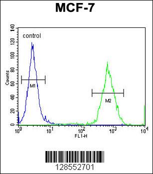 GPD1L Antibody (N-term) (Cat. AMM05181G) flow cytometric analysis of MCF-7 cells (right histogram) compared to a negative control cell (left histogram).FITC-conjugated goat-anti-rabbit secondary antibodies were used for the analysis. |