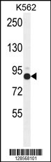 ZNF366 Antibody (C-term) (Cat. AMM08548G) western blot analysis in K562 cell line lysates (35ug/lane).This demonstrates the ZNF366 antibody detected the ZNF366 protein (arrow). |