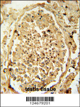 PDHA2 antibody (Center) (Cat. APR09007G) immunohistochemistry analysis in formalin fixed and paraffin embedded human testis tissue followed by peroxidase conjugation of the secondary antibody and DAB staining. This data demonstrates the use of the PDHA2 antibody (Center) for immunohistochemistry. Clinical relevance has not been evaluated. |