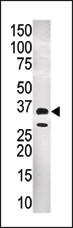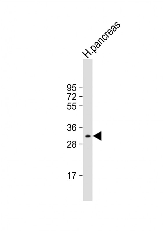 Anti-GNMT Antibody (C-term) at 1:1000 dilution + human pancreas lysate Lysates/proteins at 20 μg per lane. Secondary Goat Anti-Rabbit IgG, (H+L), Peroxidase conjugated at 1/10000 dilution. Predicted band size : 33 kDa Blocking/Dilution buffer: 5% NFDM/TBST.