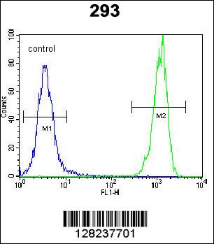 OR10H1 Antibody (C-term) (Cat. AMM06930G) flow cytometric analysis of 293 cells (right histogram) compared to a negative control cell (left histogram).FITC-conjugated goat-anti-rabbit secondary antibodies were used for the analysis. |