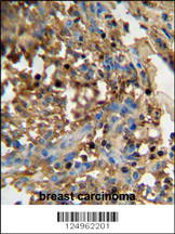 DMP4 antibody (C-term) (Cat. APR15750G) immunohistochemistry analysis in formalin fixed and paraffin embedded human breast carcinoma followed by peroxidase conjugation of the secondary antibody and DAB staining. This data demonstrates the use of the DMP4 antibody (C-term) for immunohistochemistry. Clinical relevance has not been evaluated. |