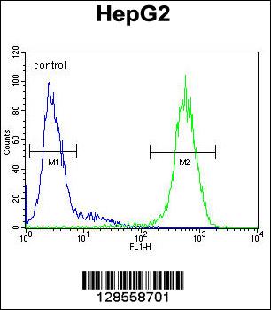 ICAM2 Antibody (Center) (Cat. APR16796G) flow cytometric analysis of HepG2 cells (right histogram) compared to a negative control cell (left histogram).FITC-conjugated goat-anti-rabbit secondary antibodies were used for the analysis. |