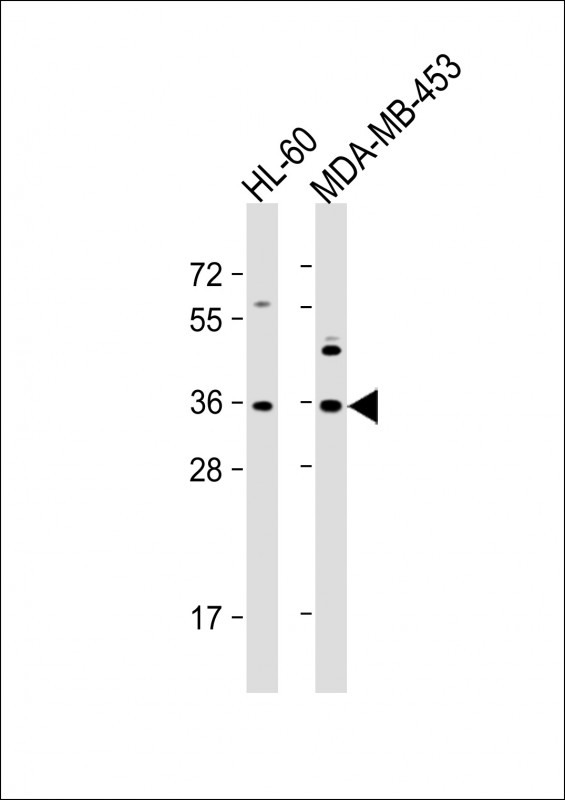 All lanes : Anti-OR1J4 Antibody (C-term) at 1:1000 dilution Lane 1: HL-60 whole cell lysate Lane 2: MDA-MB-453 whole cell lysate Lysates/proteins at 20 μg per lane. Secondary Goat Anti-Rabbit IgG, (H+L), Peroxidase conjugated at 1/10000 dilution. Predicted band size : 35 kDa Blocking/Dilution buffer: 5% NFDM/TBST.