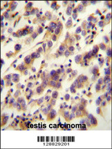 OR1J4 antibody (C-term) (Cat. APR12533G) immunohistochemistry analysis in formalin fixed and paraffin embedded human testis carcinoma followed by peroxidase conjugation of the secondary antibody and DAB staining. This data demonstrates the use of the OR1J4 antibody (C-term) for immunohistochemistry. Clinical relevance has not been evaluated. |