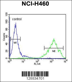 OR2Z1 Antibody (N-term) (Cat. APR12561G) flow cytometric analysis of NCI-H460 cells (right histogram) compared to a negative control cell (left histogram).FITC-conjugated goat-anti-rabbit secondary antibodies were used for the analysis. |
