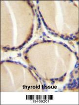 CALCA Antibody (Center) (Cat. APR11539G)immunohistochemistry analysis in formalin fixed and paraffin embedded human thyroid tissue followed by peroxidase conjugation of the secondary antibody and DAB staining.This data demonstrates the use of CALCA Antibody (Center) for immunohistochemistry. Clinical relevance has not been evaluated. |