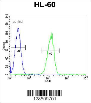 GPR142 Antibody (N-term) (Cat. AMM05962G) flow cytometric analysis of HL-60 cells (right histogram) compared to a negative control cell (left histogram).FITC-conjugated goat-anti-rabbit secondary antibodies were used for the analysis. |