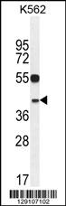 YOD1 Antibody (C-term) (Cat. APR14430G) western blot analysis in K562 cell line lysates (35ug/lane).This demonstrates the YOD1 antibody detected the YOD1 protein (arrow).