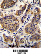 YOD1 Antibody (C-term) (Cat. APR14430G)immunohistochemistry analysis in formalin fixed and paraffin embedded human bladder carcinoma followed by peroxidase conjugation of the secondary antibody and DAB staining.This data demonstrates the use of YOD1 Antibody (C-term) for immunohistochemistry. Clinical relevance has not been evaluated.