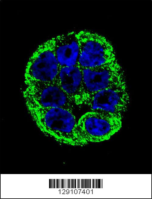 Confocal immunofluorescent analysis of YOD1 Antibody (C-term)( APR14430G) with WiDr cell followed by Alexa Fluor 488-conjugated goat anti-rabbit lgG (green). DAPI was used to stain the cell nuclear (blue). |