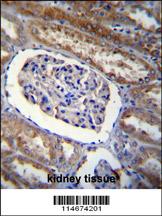 ARL8 Antibody (C-term) (Cat. APR15056G)immunohistochemistry analysis in formalin fixed and paraffin embedded human kidney tissue followed by peroxidase conjugation of the secondary antibody and DAB staining.This data demonstrates the use of ARL8 Antibody (C-term) for immunohistochemistry. Clinical relevance has not been evaluated.