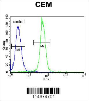 ARL8 Antibody (C-term) (Cat. APR15056G) flow cytometric analysis of CEM cells (right histogram) compared to a negative control cell (left histogram).FITC-conjugated goat-anti-rabbit secondary antibodies were used for the analysis. |