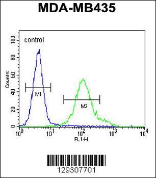GRIN2A Antibody (C-term) (Cat. APR12271G) flow cytometric analysis of MDA-MB435 cells (right histogram) compared to a negative control cell (left histogram).FITC-conjugated goat-anti-rabbit secondary antibodies were used for the analysis. |