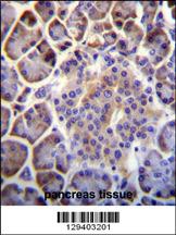 C6orf138 Antibody (Center) (Cat. APR15208G)immunohistochemistry analysis in formalin fixed and paraffin embedded human pancreas tissue followed by peroxidase conjugation of the secondary antibody and DAB staining.This data demonstrates the use of C6orf138 Antibody (Center) for immunohistochemistry. Clinical relevance has not been evaluated. |