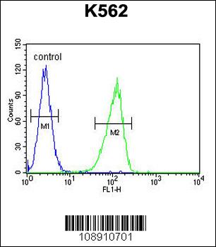 CRFR1 Antibody (Q103) (Cat. APG02767G) flow cytometric analysis of K562 cells (right histogram) compared to a negative control cell (left histogram).FITC-conjugated goat-anti-rabbit secondary antibodies were used for the analysis. |