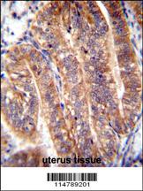 NUMB Antibody (N-term) (Cat. AMM06871G)immunohistochemistry analysis in formalin fixed and paraffin embedded human uterus tissue followed by peroxidase conjugation of the secondary antibody and DAB staining.This data demonstrates the use of NUMB Antibody (N-term) for immunohistochemistry. Clinical relevance has not been evaluated. |