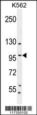 SP1 Antibody (C-term P692) (Cat. APR07185G) western blot analysis in K562 cell line lysates (35ug/lane).This demonstrates the SP1 antibody detected the SP1 protein (arrow).