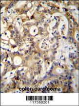 SP1 Antibody (C-term P692) (Cat. APR07185G)immunohistochemistry analysis in formalin fixed and paraffin embedded human colon carcinoma followed by peroxidase conjugation of the secondary antibody and DAB staining.This data demonstrates the use of SP1 Antibody (C-term P692) for immunohistochemistry. Clinical relevance has not been evaluated. |