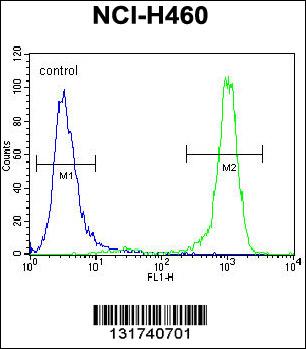 CHRND Antibody (Center) (Cat. APG03223G) flow cytometric analysis of NCI-H460 cells (right histogram) compared to a negative control cell (left histogram).FITC-conjugated goat-anti-rabbit secondary antibodies were used for the analysis. |