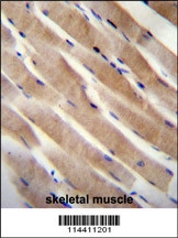 RHEB Antibody (C-term) (Cat. AMR09752G)immunohistochemistry analysis in formalin fixed and paraffin embedded human skeletal muscle followed by peroxidase conjugation of the secondary antibody and DAB staining.This data demonstrates the use of RHEB Antibody (C-term) for immunohistochemistry. Clinical relevance has not been evaluated. |