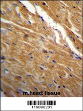 TBC1D13 Antibody (Center) (Cat. AMM08101G)immunohistochemistry analysis in formalin fixed and paraffin embedded mouse heart tissue followed by peroxidase conjugation of the secondary antibody and DAB staining.This data demonstrates the use of TBC1D13 Antibody (Center) for immunohistochemistry. Clinical relevance has not been evaluated. |