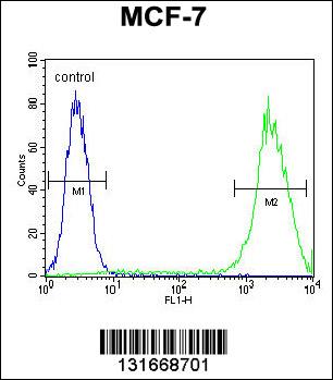 LGALS3 Antibody (C-term) (Cat. AMM05458G) flow cytometric analysis of MCF-7 cells (right histogram) compared to a negative control cell (left histogram).FITC-conjugated goat-anti-rabbit secondary antibodies were used for the analysis. |