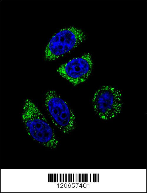 Confocal immunofluorescent analysis of EDN1 Antibody (C-term)( APR07642G) with A549 cell followed by Alexa Fluor 488-conjugated goat anti-rabbit lgG (green). DAPI was used to stain the cell nuclear (blue). |