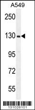 RPGR Antibody (C-term) (Cat. APR13146G) western blot analysis in A549 cell line lysates (35ug/lane).This demonstrates the RPGR antibody detected the RPGR protein (arrow).
