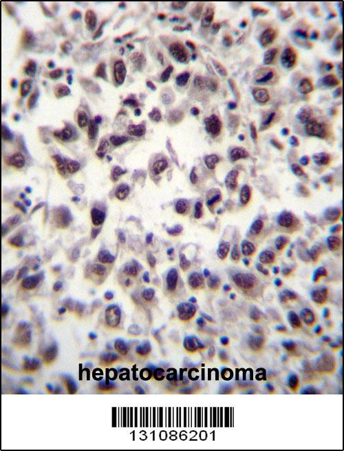 SFRS7 Antibody (N-term) (Cat. APR13286G)immunohistochemistry analysis in formalin fixed and paraffin embedded human hepatocarcinoma tissue followed by peroxidase conjugation of the secondary antibody and DAB staining.This data demonstrates the use of SFRS7 Antibody (N-term) for immunohistochemistry. Clinical relevance has not been evaluated. |