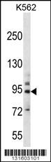 PCDHB14 Antibody (N-term) (Cat. AMM07043G) western blot analysis in K562 cell line lysates (35ug/lane).This demonstrates the PCDHB14 antibody detected the PCDHB14 protein (arrow).