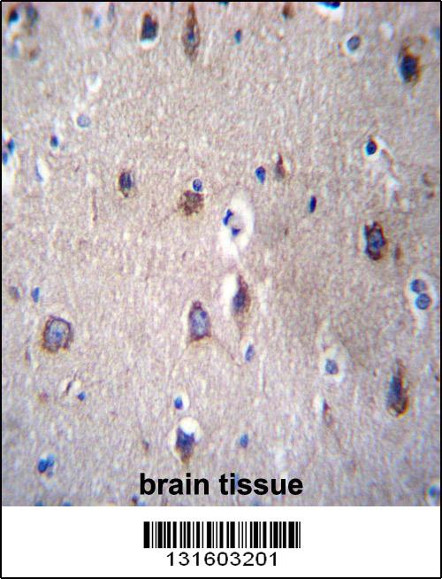 PCDHB14 Antibody (N-term) (Cat. AMM07043G)immunohistochemistry analysis in formalin fixed and paraffin embedded human brain tissue followed by peroxidase conjugation of the secondary antibody and DAB staining.This data demonstrates the use of PCDHB14 Antibody (N-term) for immunohistochemistry. Clinical relevance has not been evaluated.