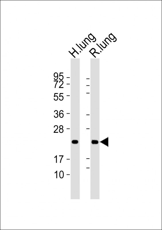 All lanes : Anti-SFTPC Antibody (N-term) at 1:2000 dilution Lane 1: human lung lysates Lane 2: rat lung lysates Lysates/proteins at 20 μg per lane. Secondary Goat Anti-Rabbit IgG, (H+L), Peroxidase conjugated at 1/10000 dilution Predicted band size : 21 kDa Blocking/Dilution buffer: 5% NFDM/TBST.