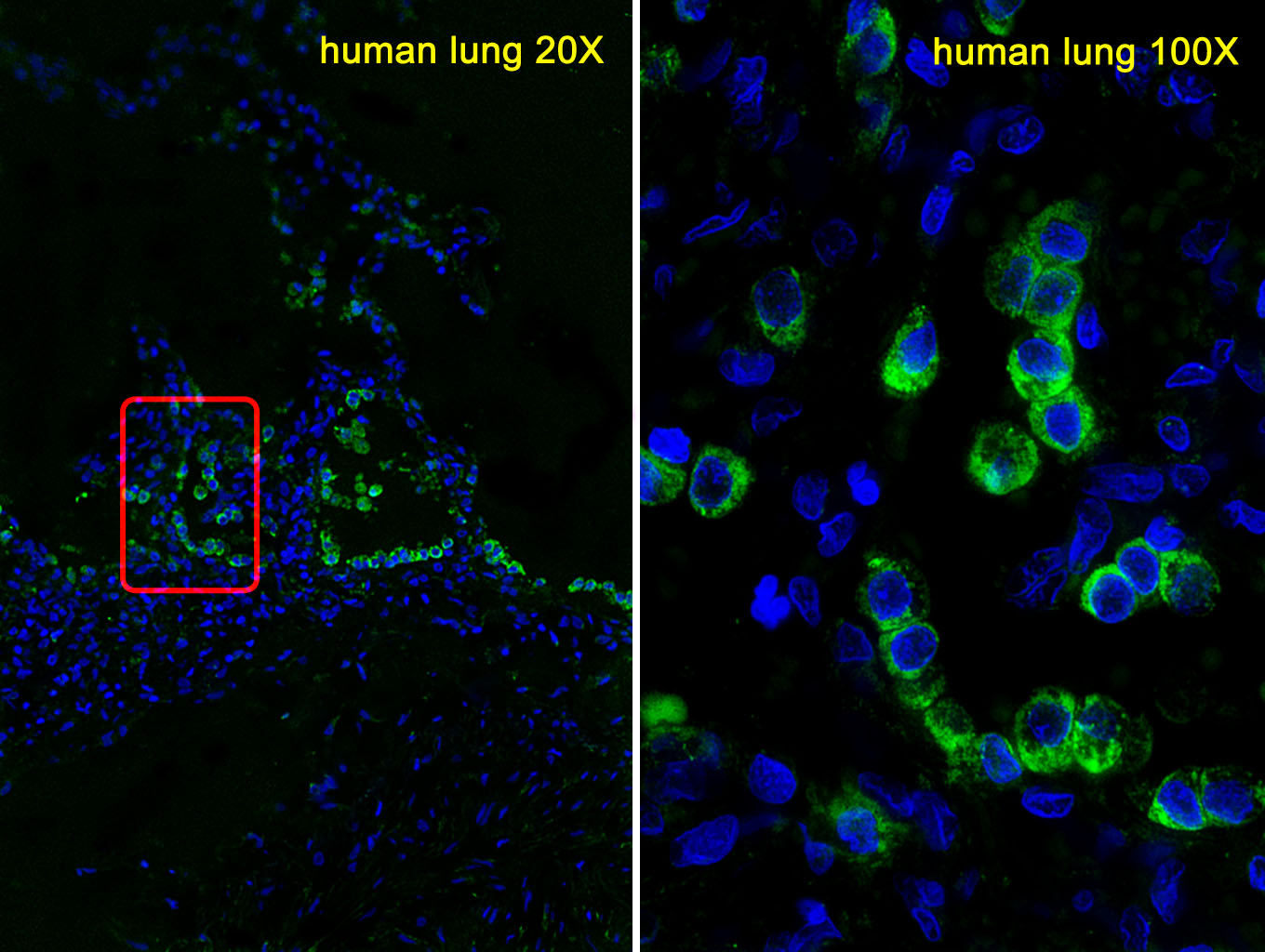 Immunofluorescent analysis of Human lung tissues, using SFTPC Antibody (N-term) (Cat. AMR09890G). AMR09890G was diluted at 1:25 dilution. Alexa Fluor 488-conjugated goat anti-rabbit lgG at 1:400 dilution was used as the secondary antibody (green). DAPI was used to stain the cell nuclear (blue).