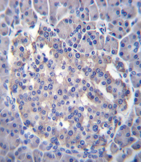 Sestrin-3 Antibody (Center Y335) (Cat. APR07009G)immunohistochemistry analysis in formalin fixed and paraffin embedded human pancreas tissue followed by peroxidase conjugation of the secondary antibody and DAB staining.This data demonstrates the use of Sestrin-3 Antibody (Center Y335) for immunohistochemistry. Clinical relevance has not been evaluated. |