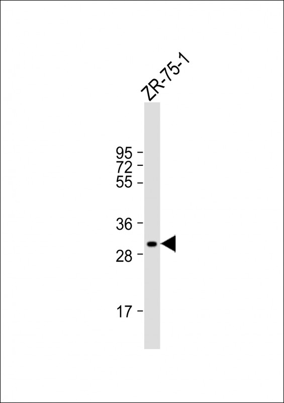 Anti-MYOGENIN Antibody (N-term) at 1:1000 dilution + ZR-75-1 whole cell lysate Lysates/proteins at 20 μg per lane. Secondary Goat Anti-Rabbit IgG, (H+L), Peroxidase conjugated at 1/10000 dilution. Predicted band size : 25 kDa Blocking/Dilution buffer: 5% NFDM/TBST.