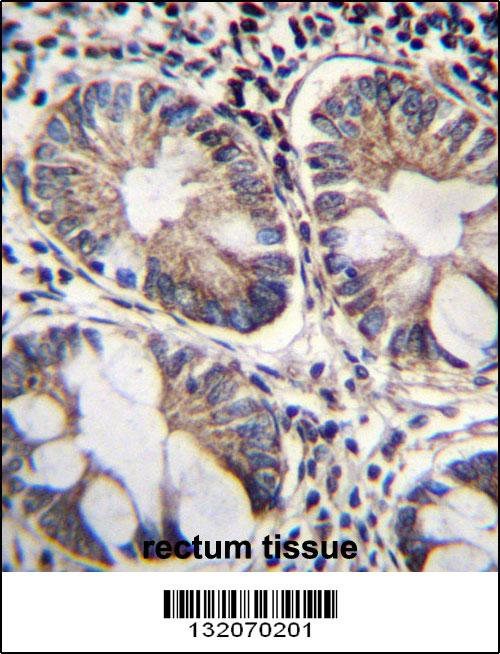 ME2 Antibody (C-term) (Cat. APR08413G)immunohistochemistry analysis in formalin fixed and paraffin embedded human rectum tissue followed by peroxidase conjugation of the secondary antibody and DAB staining.This data demonstrates the use of ME2 Antibody (C-term) for immunohistochemistry. Clinical relevance has not been evaluated.