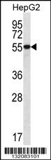 UGDH Antibody (C-term) (Cat. APR10653G) western blot analysis in HepG2 cell line lysates (35ug/lane).This demonstrates the UGDH antibody detected the UGDH protein (arrow).
