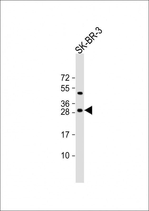 Anti-CSN2 Antibody (N-term) at 1:1000 dilution + SK-BR-3 whole cell lysate Lysates/proteins at 20 μg per lane. Secondary Goat Anti-Rabbit IgG, (H+L), Peroxidase conjugated at 1/10000 dilution. Predicted band size : 25 kDa Blocking/Dilution buffer: 5% NFDM/TBST. |