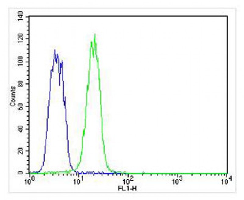 Overlay histogram showing K562 cells stained with AMM06212G (green line). The cells were fixed with 4% paraformaldehyde (10 min) and then permeabilized with 90% methanol for 10 min. The cells were then icubated in 2% bovine serum albumin to block non-specific protein-protein interactions followed by the antibody (AMM06212G, 1:25 dilution) for 60 min at 37?C. The secondary antibody used was Alexa Fluor? 488 goat anti-rabbit lgG (H+L) (1583138) at 1/400 dilution for 40 min at 37?C. Isotype control antibody (blue line) was rabbit IgG1 (1μg/1x10^6 cells) used under the same conditions. Acquisition of >10, 000 events was performed.
