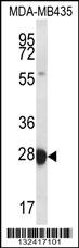 RAB27B Antibody (Center) (Cat. AMM07461G) western blot analysis in MDA-MB435 cell line lysates (35ug/lane).This demonstrates the RAB27B antibody detected the RAB27B protein (arrow).