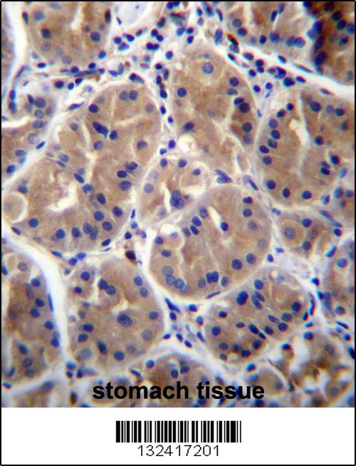 RAB27B Antibody (Center) (Cat. AMM07461G)immunohistochemistry analysis in formalin fixed and paraffin embedded human stomach tissue followed by peroxidase conjugation of the secondary antibody and DAB staining.This data demonstrates the use of RAB27B Antibody (Center) for immunohistochemistry. Clinical relevance has not been evaluated. |