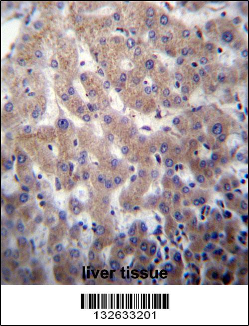 POFUT2 Antibody (Center) (Cat. AMR09418G)immunohistochemistry analysis in formalin fixed and paraffin embedded human liver tissue followed by peroxidase conjugation of the secondary antibody and DAB staining.This data demonstrates the use of POFUT2 Antibody (Center) for immunohistochemistry. Clinical relevance has not been evaluated. |