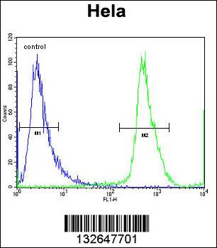 NUP35 Antibody (C-term) (Cat. APR17624G) flow cytometric analysis of Hela cells (right histogram) compared to a negative control cell (left histogram).FITC-conjugated goat-anti-rabbit secondary antibodies were used for the analysis. |