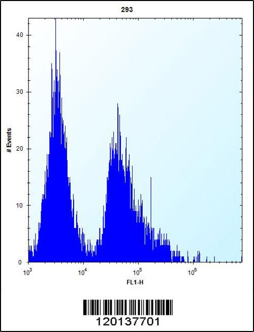 GSTT1 Antibody (N-term) (Cat. AMM05271G) flow cytometric analysis of 293 cells (right histogram) compared to a negative control cell (left histogram).FITC-conjugated goat-anti-rabbit secondary antibodies were used for the analysis. |