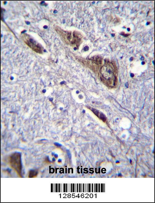 ELAVL2 Antibody (Center) (Cat. APG03272G)immunohistochemistry analysis in formalin fixed and paraffin embedded human brain tissue followed by peroxidase conjugation of the secondary antibody and DAB staining.This data demonstrates the use of ELAVL2 Antibody (Center) for immunohistochemistry. Clinical relevance has not been evaluated. |