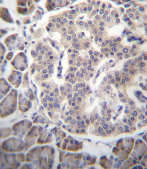 SFRP5 Antibody (Center) (Cat. AMM07763G)immunohistochemistry analysis in formalin fixed and paraffin embedded human pancreas tissue followed by peroxidase conjugation of the secondary antibody and DAB staining.This data demonstrates the use of SFRP5 Antibody (Center) for immunohistochemistry. Clinical relevance has not been evaluated. |