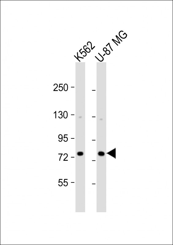 All lanes : Anti-ARHGAP22 Antibody (C-term) at 1:1000 dilution Lane 1: K562 whole cell lysate Lane 2: U-87 MG whole cell lysate Lysates/proteins at 20 μg per lane. Secondary Goat Anti-Rabbit IgG, (H+L), Peroxidase conjugated at 1/10000 dilution. Predicted band size : 77 kDa Blocking/Dilution buffer: 5% NFDM/TBST.