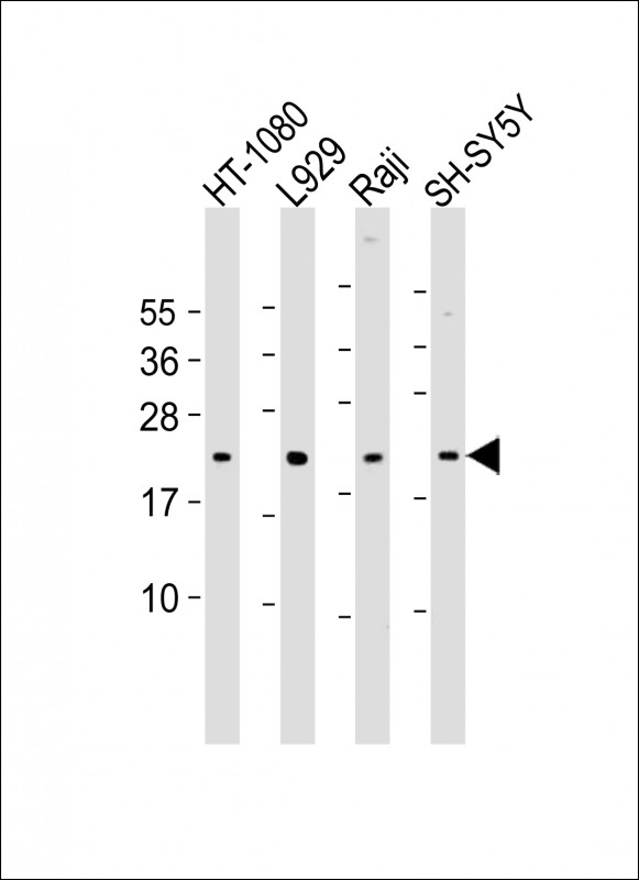 All lanes : Anti-Bax Antibody (BH3) at 1:2000 dilution Lane 1: HT-1080 whole cell lysate Lane 2: L929 whole cell lysate Lane 3: Raji whole cell lysate Lane 4: SH-SY5Y whole cell lysate Lysates/proteins at 20 μg per lane. Secondary Goat Anti-Rabbit IgG, (H+L), Peroxidase conjugated at 1/10000 dilution. Predicted band size : 21 kDa Blocking/Dilution buffer: 5% NFDM/TBST.